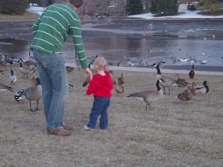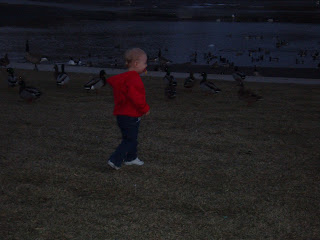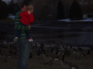 Tonight we went to have dinner with Joey's family at Sizzler in Sugarhouse and decided to stop by Sugarhouse Park first. There were a ton of Geese and ducks out, it was really neat. There were some other people there that were kind enough to give us some bread so that Taylar could feed them. I got a little nervous with her around the Geese. I just kept having a mental image of one of them poking their beaks into her eye, lol. She loved the whole experience though. She quacked at them and was having a really great time!! Sorry the pics are so dark, she was moving around so much that the night time setting on our camera just made the pictures blurry.